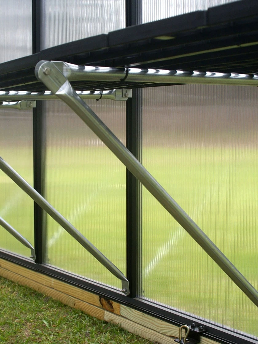 The Monticello 12 foot Work Station Kit is specifically designed for the Monticello line of 12FT greenhouses. The design is simple, unique and thoughtful. The Work Station can be installed either during initial construction or at a later time. The Kit Includes a full 12 ft run (24” deep) for use on either side of the Monticello greenhouse. Since the installation of the support bars uses the inside bolt tracks the shelving could be set at any height within the greenhouse (up to 4ft off the ground). The sturdy vented shelving units on the Work Station are constructed from commercial grade high impact PVC. The vents allow water and air to circulate as well as allowing sunlight to reach underneath the Work Bench. The angle support design allows for free flowing movement without concern for support legs to trip over when working at the workbench. Just like our greenhouses, the Monticello Work Station Kit is proudly made in the USA from start to finish.